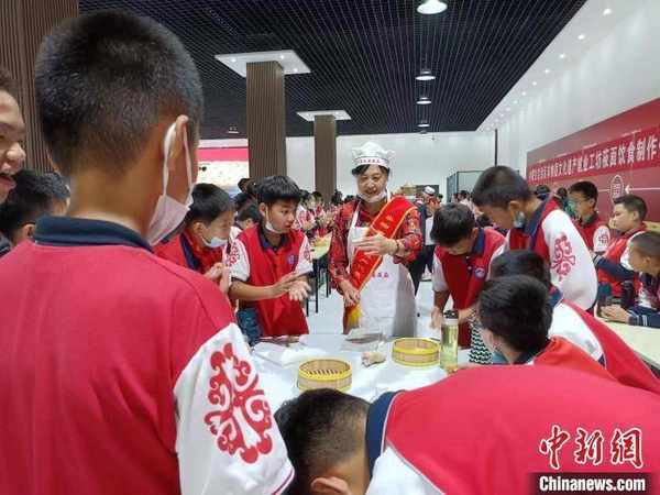圖為王改玲(左三)在教學子們制作莜面。 王改玲供圖