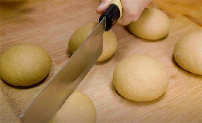 4.然後把每個劑子揉勻揉圓,上面用刀劃出十字花刀,這樣一個胚子就出來瞭。