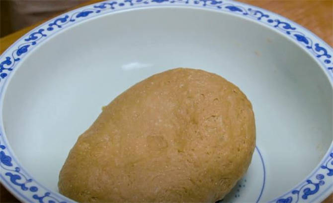 2.碗中再準備大約500g的面粉,5g酵母粉,用晾至溫熱的紅糖水和面,攪拌成大面絮,揉成一個光滑不沾手的面團就可以瞭,蓋上保鮮膜溫暖處發酵到兩倍大。