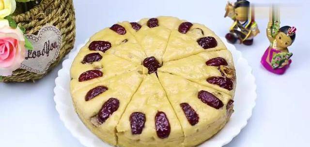 放一點幹紅棗片,攪拌一下。先放旁邊備用。然後準備一個模具把裡面刷上油,邊上也要給它刷一點,要不然蒸出來取不下來,直接倒入發好的面煳,用工具整理一下給它按平,最後在均勻的在上面擺上一圈紅棗。