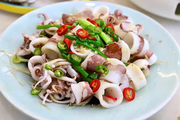 油淋東山小管,肉質鮮嫩彈牙,一點點醬汁再潑上熱油,更是保留瞭小管的原滋原味。