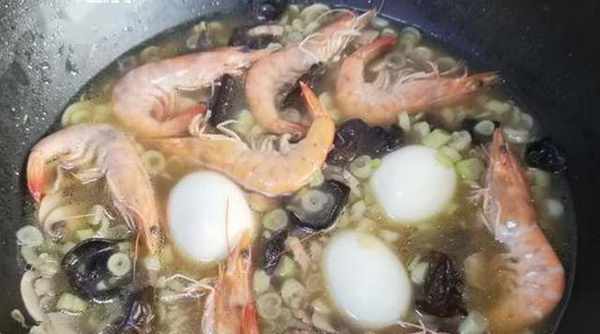 第六步:開蓋後,放入海蝦和煮雞蛋,煮至鮮蝦顏色變紅,蝦身呈鉤狀,即可關火。做雞蛋花,還可以將雞蛋打散倒入鍋中,湯的味道會更鮮美。嘗嘗湯的味道,比平時煮的味道要濃一點。