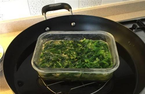第三步:碗裡倒入冷水,放上蒸架,然後把盛有菠菜和雞蛋的碗放在蒸架上。然後開火開始蒸,等看到上汽開始數,蒸10分鐘,早餐差不多就做好瞭。菠菜拿到蒸好的雞蛋後放涼,然後倒過來倒入配料,切塊裝盤即可食用。