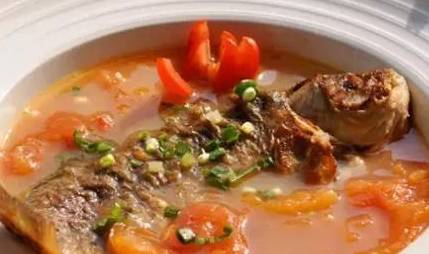 材料:鯽魚1條、西紅柿2個、小蔥2根、薑1塊、食鹽適量、胡椒粉少許、黃酒少許、色拉油適量