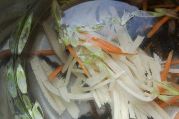 雞蛋1個,豆腐30克,胡蘿卜少許,水發木耳2朵,鹽1勺,醋2勺,白胡椒粉1勺,淀粉10克,蔥花兒少許,植物油(可不放)少許,高湯(或水)1.5升。