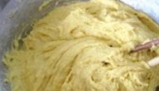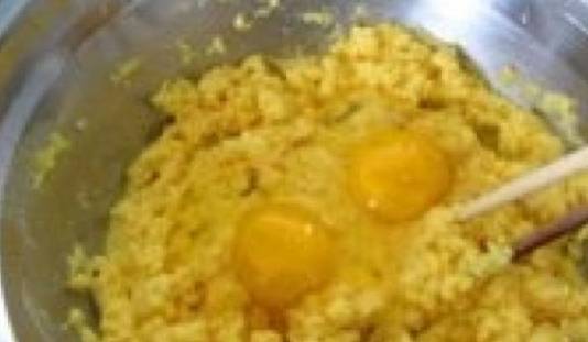 做這道美食,需要用到的就是玉米面瞭,用開水和面,邊倒開水邊攪,直到沒有幹粉,然後打雞蛋進去,然後攪成面糊,然後加一點其他東西進去,酵母、豆粉、白面粉,然後再加一點白糖,這樣吃起來就甜甜的,口感十分好,加完之後接著攪拌!攪均勻成這樣的發糕面糊!
