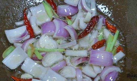 4、起鍋放油,放生薑,大蒜,幹紅椒,洋蔥一起煸炒出香味。