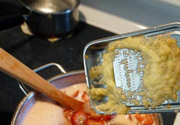 4.加入蘋果泥,我怕蘋果泥會氧化變黑,所以是煮草莓的時候才磨的,磨到剩一小塊的時候不小心掉進草莓醬裡,趕快撈出來吃掉,結果發現沾瞭草莓醬的蘋果好好吃↓↓↓