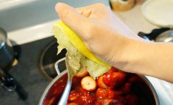 3.草莓與糖漿倒入鍋內,加入檸檬汁一起煮(再囉嗦一遍快速擠檸檬汁的方法:用一隻叉子邊轉邊擠壓,一下下就擠的很幹凈瞭)↓↓↓