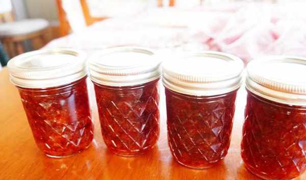6.煮好後趁熱裝瓶,直立放涼後會聽到啵一聲,瓶蓋會從凸的變凹的,一般說法都叫人裝瓶後要倒扣放涼,我從來不這麼做,因為看到瓶蓋沾滿果醬不用等月圓我就會變狼人,上回法式草莓果醬為瞭示范何謂倒扣,已經忍痛倒瞭一次,不瞭解如何倒扣的人可以到那篇看一下,這次沒有煮得像上回的法式草莓果醬那麼幹,最後做出瞭四瓶8OZ的果醬↓↓↓