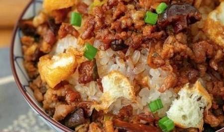 很難想象溫州人沒有瞭糯米飯會怎樣,在溫州美食榜上,糯米飯的地位數一數二。舀一勺糯米,加入香脆的老油條,最後再澆上一勺香菇肉末汁,一點點蔥花點綴就完成瞭。