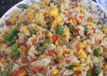 原材料:剩米飯、雞蛋、青豆、蔥、胡椒粉、雞精、白糖、油、食鹽。