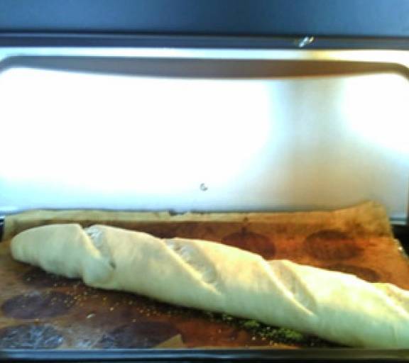 第17步、放入烤箱,中層,上下火230度,並每隔30秒向烤箱內噴水以制造蒸汽,三次以後,關上烤箱門,烘烤30分鐘左右。