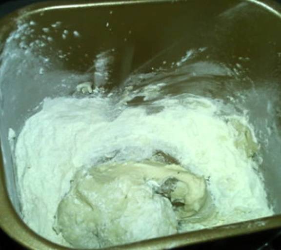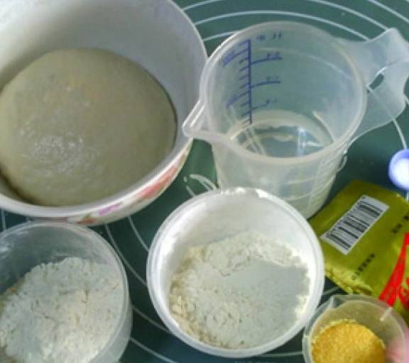 第6步、主面團:中種面團全部,高筋粉35克,中筋粉35克,鹽1克,幹酵母0.5克,水42克,粗玉米粉適量