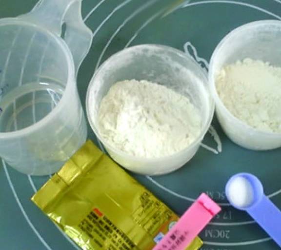 第1步、中種面團:高筋粉35克,中筋粉35克,鹽1克,幹酵母0.5克,水42克