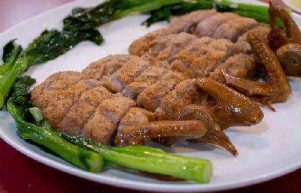 二是煲鴨和拆鴨。即將1公斤左右的泥鴨放入調配好的加入瞭香葉、草果的紅鹵水當中,以武文火煲鹵,達到軟爛後就可拆鴨大骨瞭。有經驗的師傅隻需幾分鐘就能把整鴨的大骨全部拆除,再在鴨腹腔內拍上少些幹粉,把荔茸釀填上去、抹平、捏實;最後,表面塗抹一層用凈蛋和生粉拌勻的粉漿,撒上幹粉,放入油鍋中炸,炸時須用花生油,油溫控制在140℃左右,這個過程需要師傅十分有耐心,把控油溫與時間,不能隨便翻動,直至表層變成金黃色,就可取出瀝油斬件。