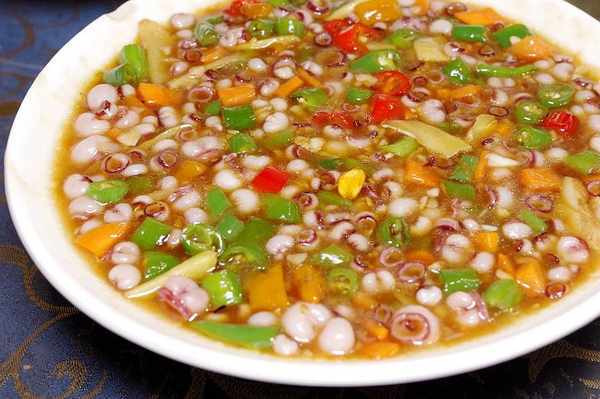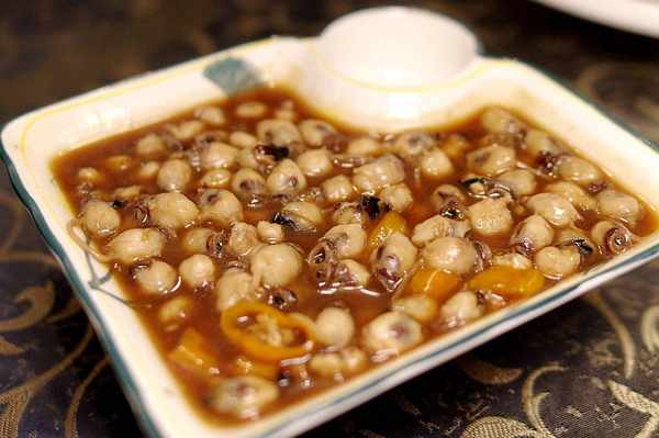 這盆看起來像薏米仁的東西我沒見過,來過的朋友強烈推薦,叫什麼海靈菇。好奇的嘗嘗看,口感略微帶脆,很奇特的感覺,後來查資料才知道是海裡軟體動物的吸盤,能吃到這麼有趣的東西吃,這樣的排檔就應該標註。