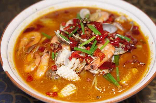 水煮三鮮:從水煮魚演變而來的這道菜幾乎每個排檔都能做,主角是魷魚,花蛤和蝦。盆子大價格實惠,喜歡的人也不少。多人聚餐很適合來一盆。如果吃飯那個湯汁湊合著拌飯也能行。