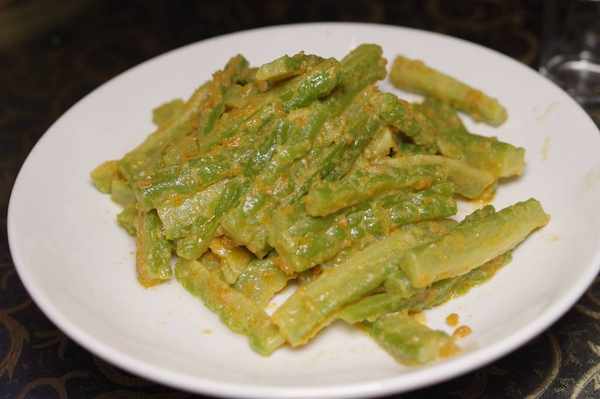 咸蛋黃炒苦瓜:蛋黃化得充分,苦瓜條包裹均勻,可見人傢廚師的基本功還是可以的。