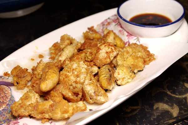 啤酒好喝,還得合適的菜來搭。除瞭上面的絲丁魚,我選擇口感紮實的煎黃魚卵,整個卵鞘過油煎香,吃的時候稍微蘸一點調和過的甜味醬油提鮮,就很帶勁。