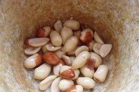 7.炒鍋中放油,把花生米冷油下鍋炒熟後盛出,碾去外皮,用搗蒜器搗成花生碎