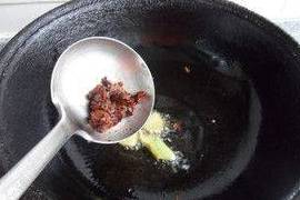 10.炒鍋中放入蔥薑塊煸出香味,加入郫縣豆醬炒出紅油
