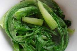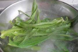 5.把摘洗幹凈的油麥菜在加瞭油和鹽的開水中焯一下