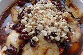 13.在魚片上放花椒碎、炸過的幹紅辣椒段、花生碎