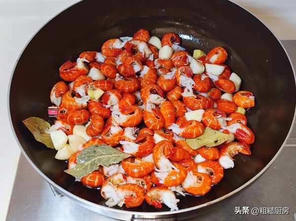 3、 大料炒香後,把準備好的龍蝦尾倒入鍋中,再加入適量料酒,快速翻炒2分鐘,這個步驟可以去掉蝦尾中多餘的腥味,還能夠蝦肉緊實彈牙。