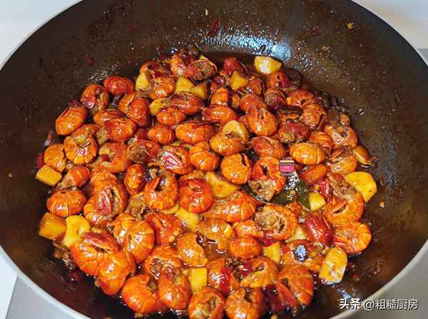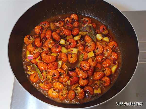 5、 加入調味料後要持續翻炒,使蝦尾均勻入味,調味料炒勻後往鍋中倒入適量啤酒和清水,開大火將湯汁煮沸,之後轉小火蓋上鍋蓋燜煮30分左右,用啤酒燉煮食材的方法還可以用來烹飪魚肉或者雞肉 ,以此來提升食材的鮮味。