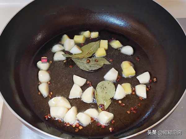 2、 鍋中燒熱油,放入薑塊、大蒜、香葉、幹辣椒、花椒,開小火煸炒,充分炒出大料的香味,這樣熬出來的料油用來炒龍蝦尾味道會格外鮮香。