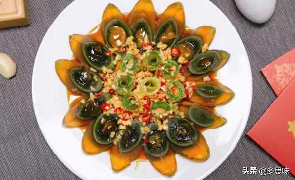 1、皮蛋去殼切成四瓣;將黃瓜削成薄片,卷成小卷,放在盤子的正中間;