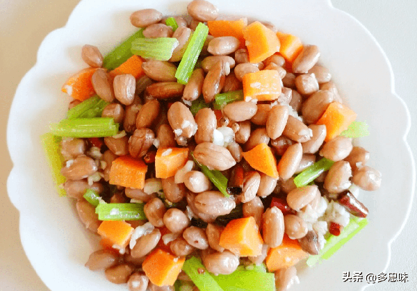 食材:花生米,胡蘿卜切丁,芹菜切小段、花椒,八角,蔥段,薑片、大蒜,幹辣椒,香油,白糖