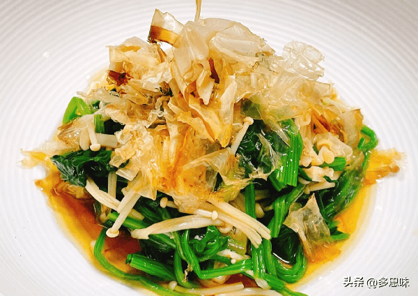食材:金針菇:150克、菠菜:6棵、醬汁配比:高湯300毫升,醬油30毫升,味淋30毫升、木魚花適量、鹽少許