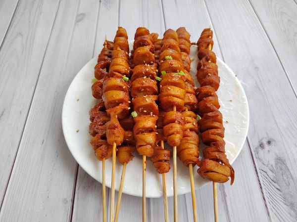 面筋解凍後,放入開水中,大火煮一分鐘,撈出裝盤,加入辣椒粉、燒烤料、十三香、生抽和白糖拌勻,醃制半小時左右,再用竹簽穿起來;烤箱預熱,烤盤鋪上油紙,擺上面筋串,刷上一些醃制面筋的料汁,烤5分鐘,再翻面刷上料汁,繼續烤5分鐘;裝盤後,撒上一些蔥花和熟芝麻點綴,就可以上桌瞭。