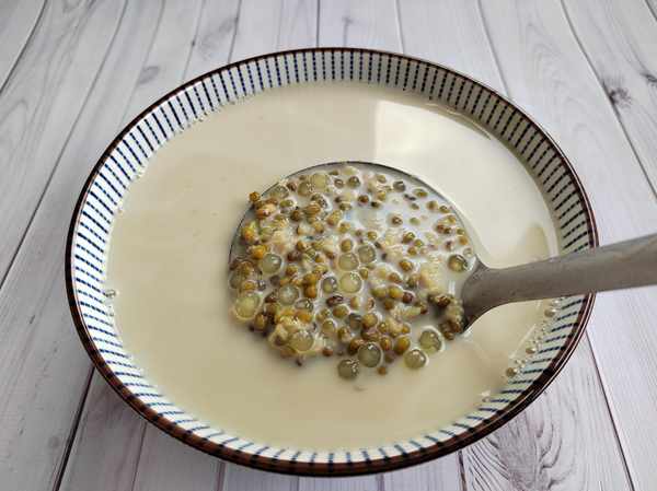 西米放入開水鍋中,大火煮1分鐘,蓋上蓋子,燜半小時:綠豆洗凈下鍋,倒入清水,大火煮至開花後;放入西米,繼續煮15分鐘左右;最後加入冰糖和牛奶拌勻就可以瞭。