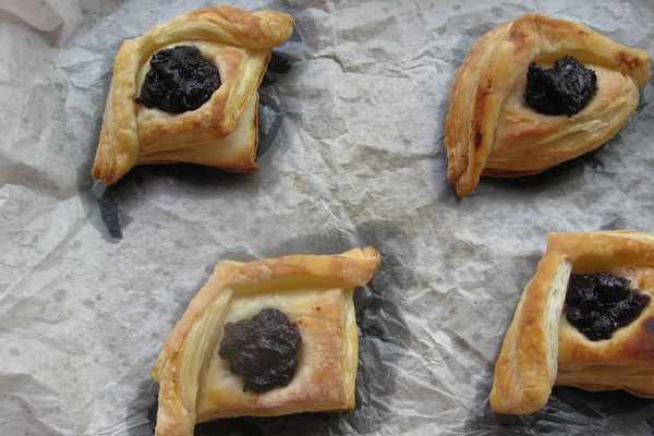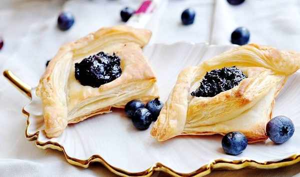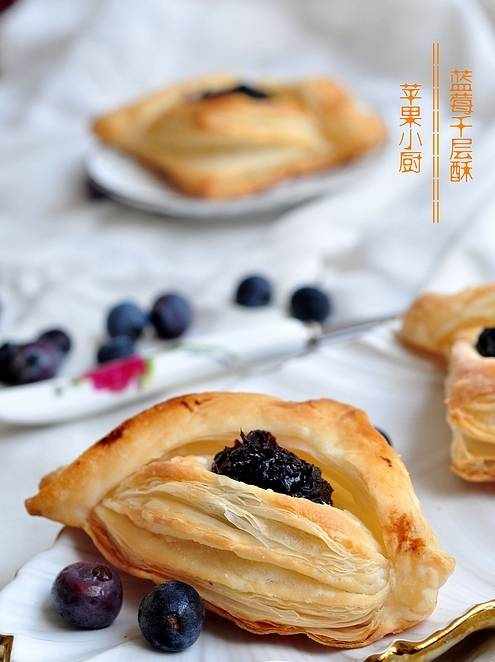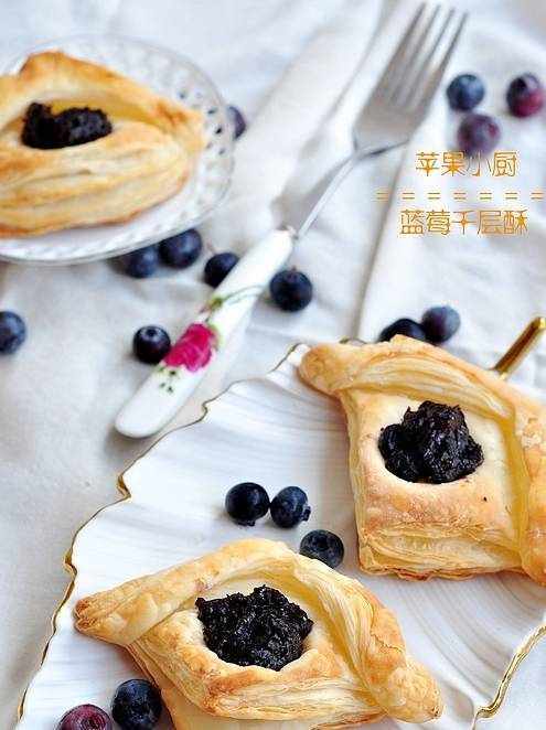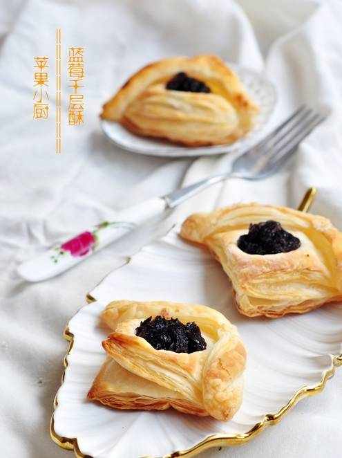8.在上面放適量藍莓醬,烤箱預熱後,中上層,220度,約10分鐘,至變金黃色起酥層即可出爐食用。如果用的果醬較稀,請註意用量。