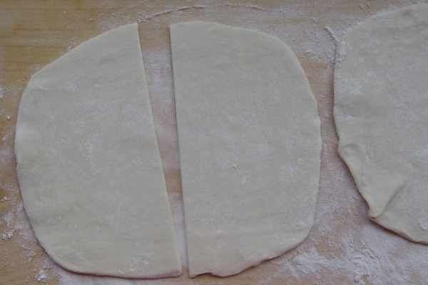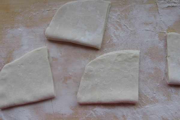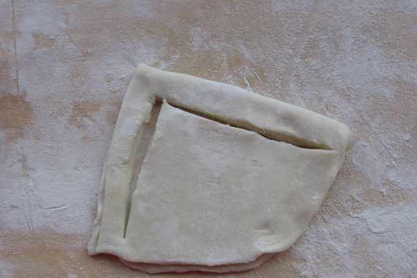 6.在對折的飛餅兩面分別切上一刀,使其呈相連直角。