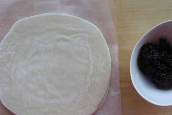 我們隻需去超市冷凍櫃采購一袋微甜味的飛餅皮。飛餅皮一般三種口味,原味微甜的,蔥香味的,原味的。您如果想做甜點就選微甜味的。再準備一瓶您自已喜歡的果醬就可。