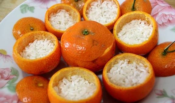 倒入淘幹凈的米,一定不能超過橘子皮空間一半的位置,因為後期我們還要加其它的輔料和水進行蒸。