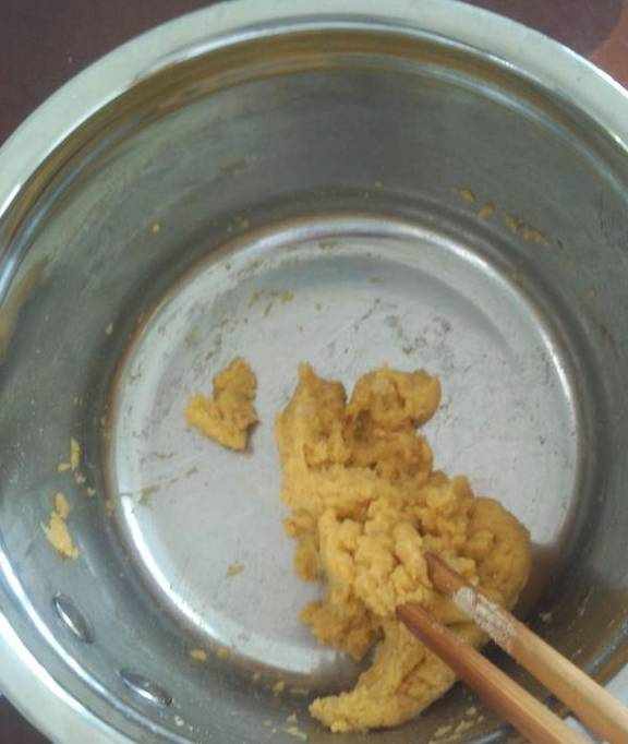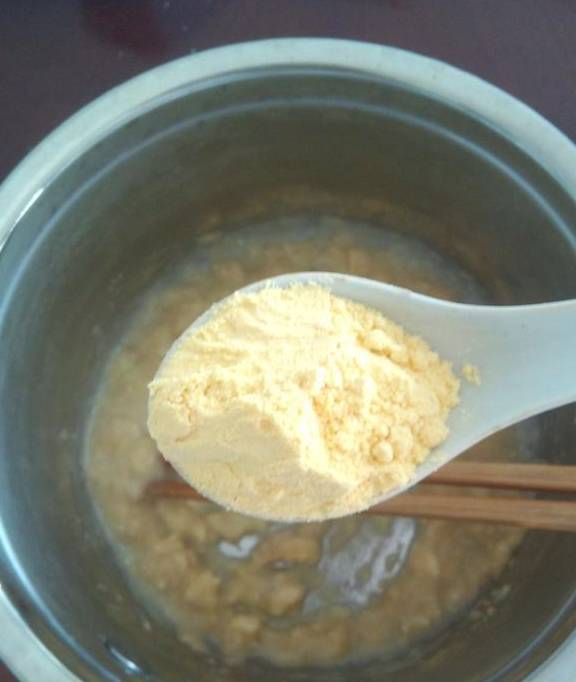 3、待香蕉糊冒泡後關掉火,再加5匙玉米面,邊加邊攪拌。