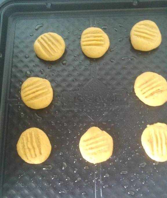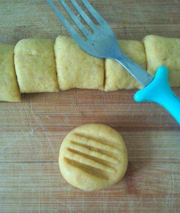 6、將小劑子團成圓形,可以用叉子壓出花紋,或者用其他的模具也可以;