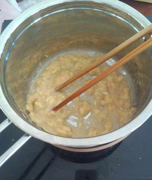 2、加熱香蕉糊,邊加熱邊用筷子攪拌。