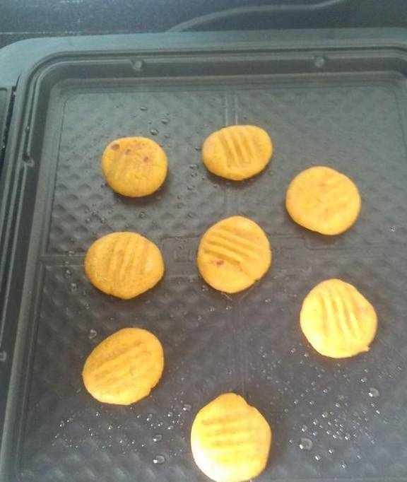 7、電餅鐺刷一層薄油預熱,將小餅均勻放在電餅鐺裡加熱。