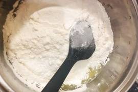 5.加入低筋面粉和泡打粉(可以過篩,也可不過)翻拌均勻