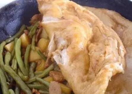 豆角烀餅,也是一道東北人傢特色的地道傢常菜。這道菜的主要食材是豆角,土豆和大肉片。鍋內放油開始煸炒五花肉,煸炒出油之後放入豆角和土豆,豆瓣醬大火爆炒一下。炒出香味之後加入清水和醬油,開始小火慢燉,清水可以加的稍微多一點,因為之後還要燜餅。發好的面搟成餅,,面餅記得加油加鹽,卷在裡面,這樣的餅吃起來更入味。最後搟好的餅碼在燉好的菜上面蓋上鍋蓋,小火在燉20分鐘,關火,這個時候的就可以開吃啦。