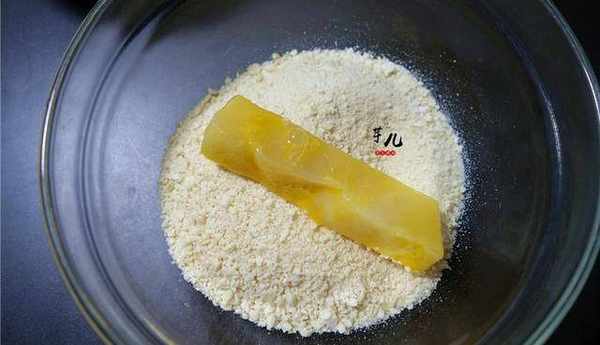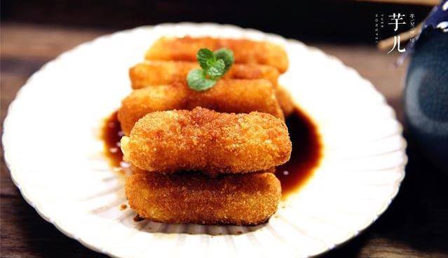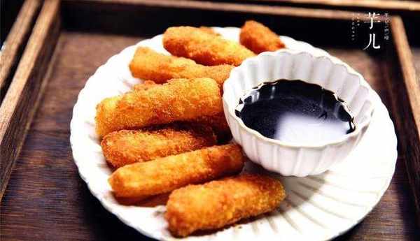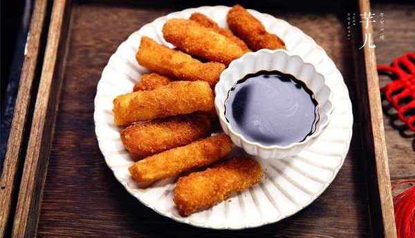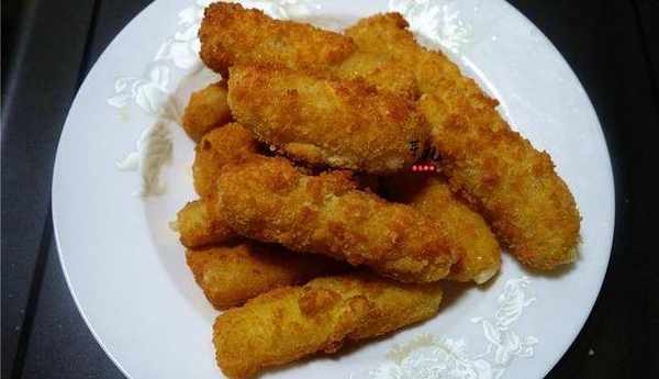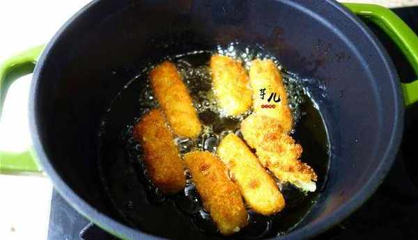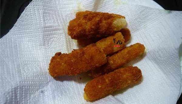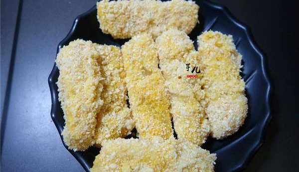 4.將年糕條放入面包糠裡滾一圈。