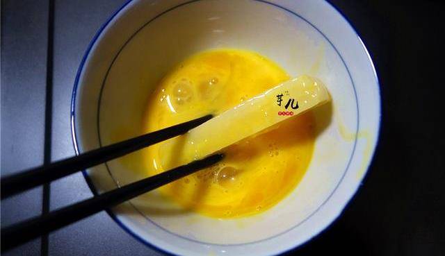 3.取一條年糕放入雞蛋液裡滾一圈,撈出。