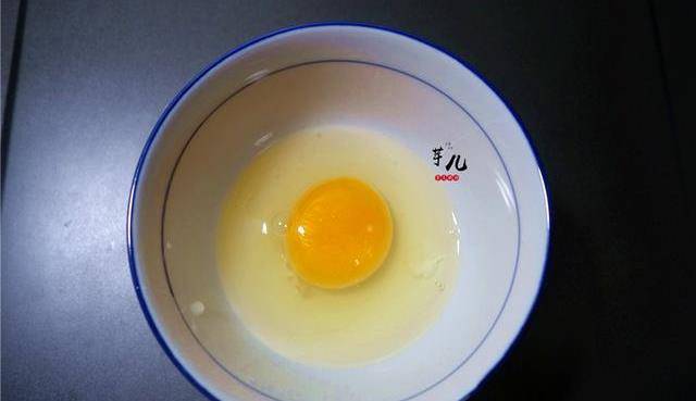 2.將一個雞蛋打入碗裡,用筷子調散。