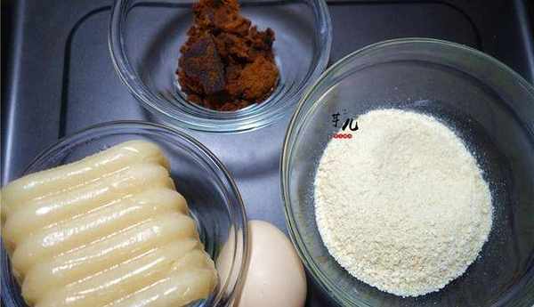 食材:年糕一塊,紅糖適量,面包糠一小半碗,雞蛋一個。
